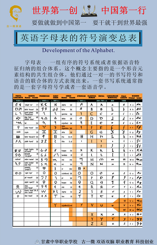 我们用传统的大家所能接受的一种英语历史的描述方法来解释,那么在古埃及的时候到腓尼基语到罗马语,其中还经过了一个西伯来语的过程,当然文字符号的演绎充满了神奇的变化,这期间英语文字符号如果谈到它始祖过程中,我们可以上溯到当时的一种非常特殊的符号系统,那就是远古埃及的特殊的文字符号系统中,以后这些符号又历尽过各种形态,方向和意义的演变,直到五百年前,英语才真正地形成了自己独立和清晰的英语语法,所以英语一直是一个不断创生,不断发展,不断进步,不断的改变的一种现代语言,它与中国的汉字有着巨大的区分,截止到今天,英语语言才真正走向了自己独立的语言体系,文字体系,语法体系和独立的哲学思想体系,这张表向我们揭示了26对字符是如何从远古时期渐渐进化,演变,逐步演绎成为现代英语文字符号的一个历史过程,看到这张表,你就会要知道一件事情,你过去所学习的那26对字符和汉字的文字一样,有着悠久的文字发展历史,只是过去你的老师从来没给你讲过这方面的知识,也就是说,你从来没有学过真正的英语文字。