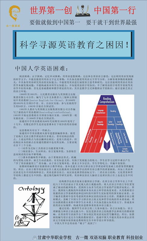 在英语语言的教育历史中,一个新的革命性的语言进化的科技创新诞生了,那就是古一徵解码英语。未来的中国人只能跟我学习,才能真正走进英语语言的世界,过去的大学生、中学生、小学生,依然还是学生,我所指的是中国所有的教授和英语教师们,作为专业从事语言教学的教授、科学家、理论建树者、语言教学工作者,如果自己对这门语言毫无所知,没有任何意识,没有任何思维,又怎能培养出合格的后人,培养出合格的社会主义社会的接班人。我们中国的英语教授们,我们中国的英语教师们,我们中国的英语教学的理论家们,首先必须面临一个真实的问题,科学发展,首先要从我们的思维科学发展开始,否则我们一定会落于时代,并被时代多抛弃。英语教学的革命必须开始,因为这是国家的呼唤。科学发展就在前方,让我们带着信心,带着准备,去迎接未来。